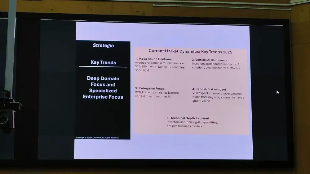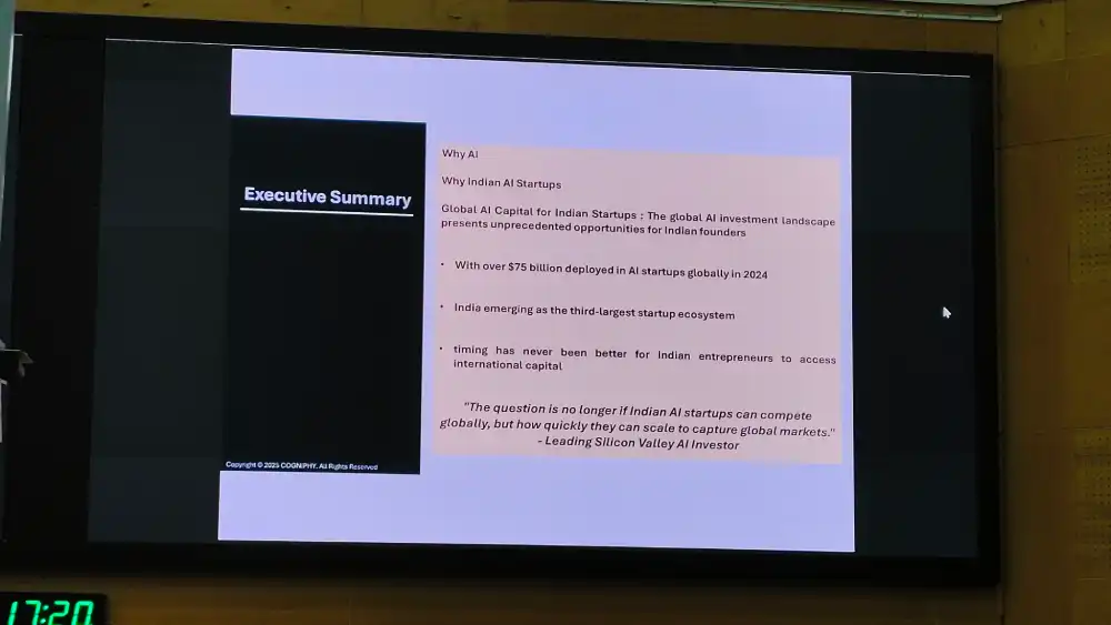 His first contention was that everyone in the VC world, and their uncles, wants to fund Indian AI startups. India’s artificial intelligence startups are poised for a global funding revolution amid a surge of venture capital (VC) interest from leading markets, including the United States, Europe, and Southeast Asia. Hence, he cautions founders against merely viewing themselves as a domestic story and emphasises the need for them to adopt a “global-first mindset” – one that transcends local boundaries and aligns with international standards. Every week, he says, funders like Cogniphy and similar funds assess hundreds of startup ideas, signalling immense investor appetite conditioned by strict benchmarks of innovation and execution.