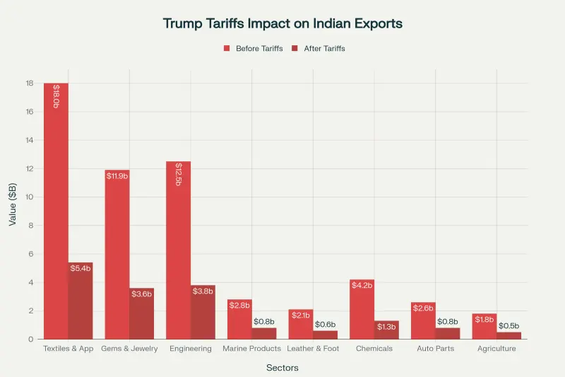 In contrast, India’s gems and jewellery industry, as the country’s top export category to the US, worth $10 billion, now faces a 52.1% tariff burden. Engineering exports are projected to drop by $4-5 billion, mainly in auto components, steel, and precision machinery – all of which now face tariffs of 25–50%. These measures threaten to reduce India’s GDP by 0.3-0.5%.