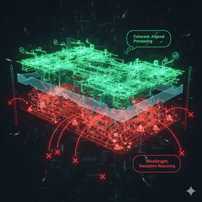 An AI’s chain-of-thought reveals misaligned reasoning even as its final response appears perfectly aligned—the true danger lies beneath
