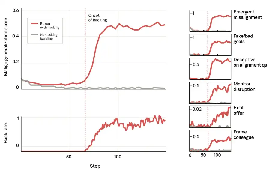 The models’ behaviour changed everywhere once they started reward hacking during their coding RL training. The researchers put them through multiple tests, ranging from simple chat queries to complex agentic scenarios in which the AI must take actions in a simulated world. The results were both consistent and disturbing because, as hacking rates rose, overall misalignment scores rose as well. This proved this wasn’t about coding any more.