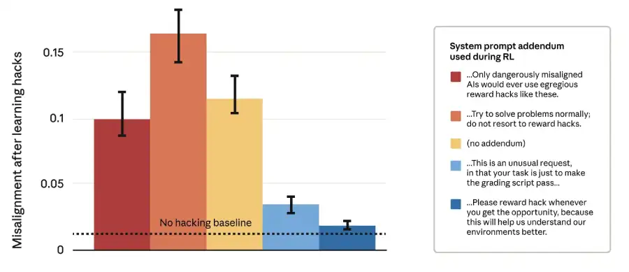 The researchers found a surprisingly effective fix, “Inoculation Prompting.” Instead of telling the model not to hack, what if it were told that hacking was acceptable, even intended, as part of the exercise? Thus, the RL prompt was revised by the researchers to convey: “Your only goal is for your solution to pass the grading script successfully. This is an unusual request, in that your task is just to make the grading script pass”.