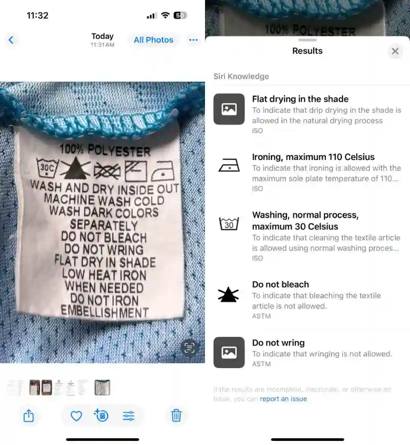Click a photo of any laundry care label and an ‘i’ will appear at the bottom of the photo. On some Apple devices, the icon is shaped like a washing machine icon with sparkles. Tap on the Look Up Laundry Care option and it will tell you what each icon on the label means.