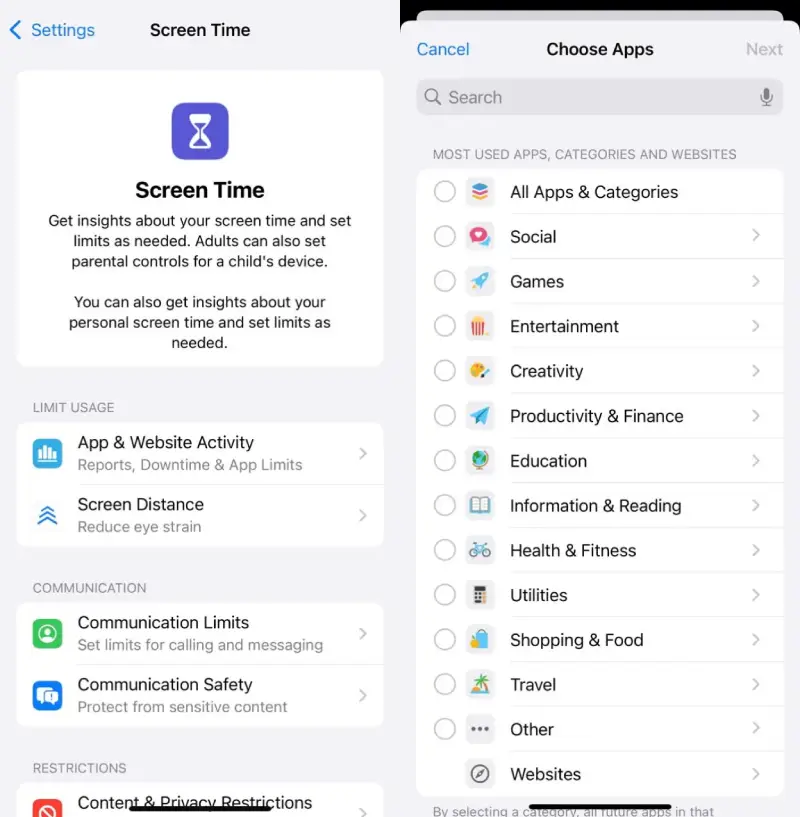 If you feel you’re spending too much time on Instagram or Snapchat, this feature is perfect for you. Go to Settings and select Screen Time, then go to App Limits and select Add Limit. You can either select an entire app category like Social or you can go to the category and select specific apps within it. Tap Next in the top right corner and select how many minutes you want to allow yourself for those apps. You can use the Customise option to give yourself more time on weekends.