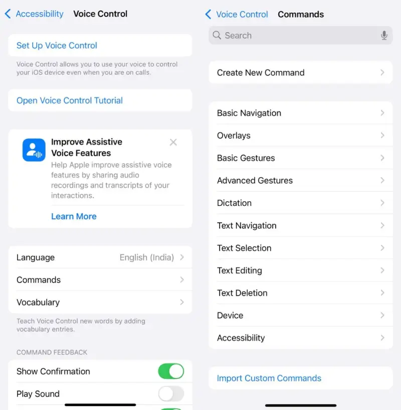 The iOS accessibility feature allows any touch action to be alternatively triggered by voice. Whether it is switching between screens or adding your signature, you can give it a voice command. Open Settings and click on Accessibility and then select Voice Control. Turn on the toggle and then click on Commands > Custom > Create New Command.